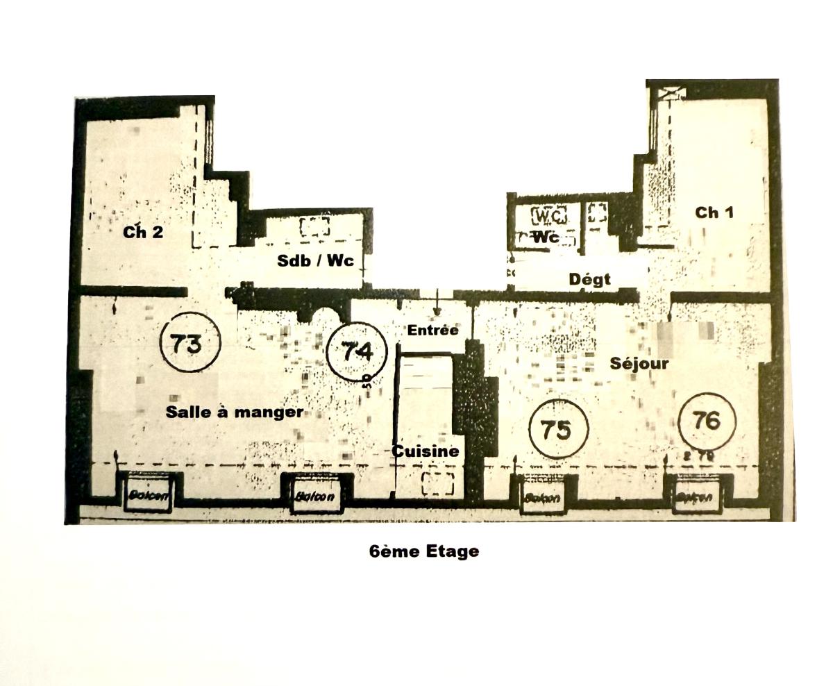 D'une superficie de 70 m2 (66,66m2 Loi Carrez) il se compose de 4 pièces, une entrée desservant de part et d'autre une salle de séjour de 19m2 avec une petite vue sur le Sacré Cœur et un salon de 20,38m2, une petite cuisine, deux chambres, une salle de bains avec WC et un wc séparé.